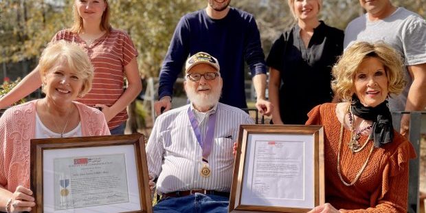 From left bottom row- Mikki Pyles PhD, (daughter) Recipient Jack Lucas 1st LT. (Ret), Betty Lucas (spouse); From left back row – Morgan Johnson(great granddaughter), Gavin Federowski (great grandson), Desiree’ Federowski, RN (granddaughter), and Mike Federowski (grandson in-law).” Rachael Anne Witherspoon