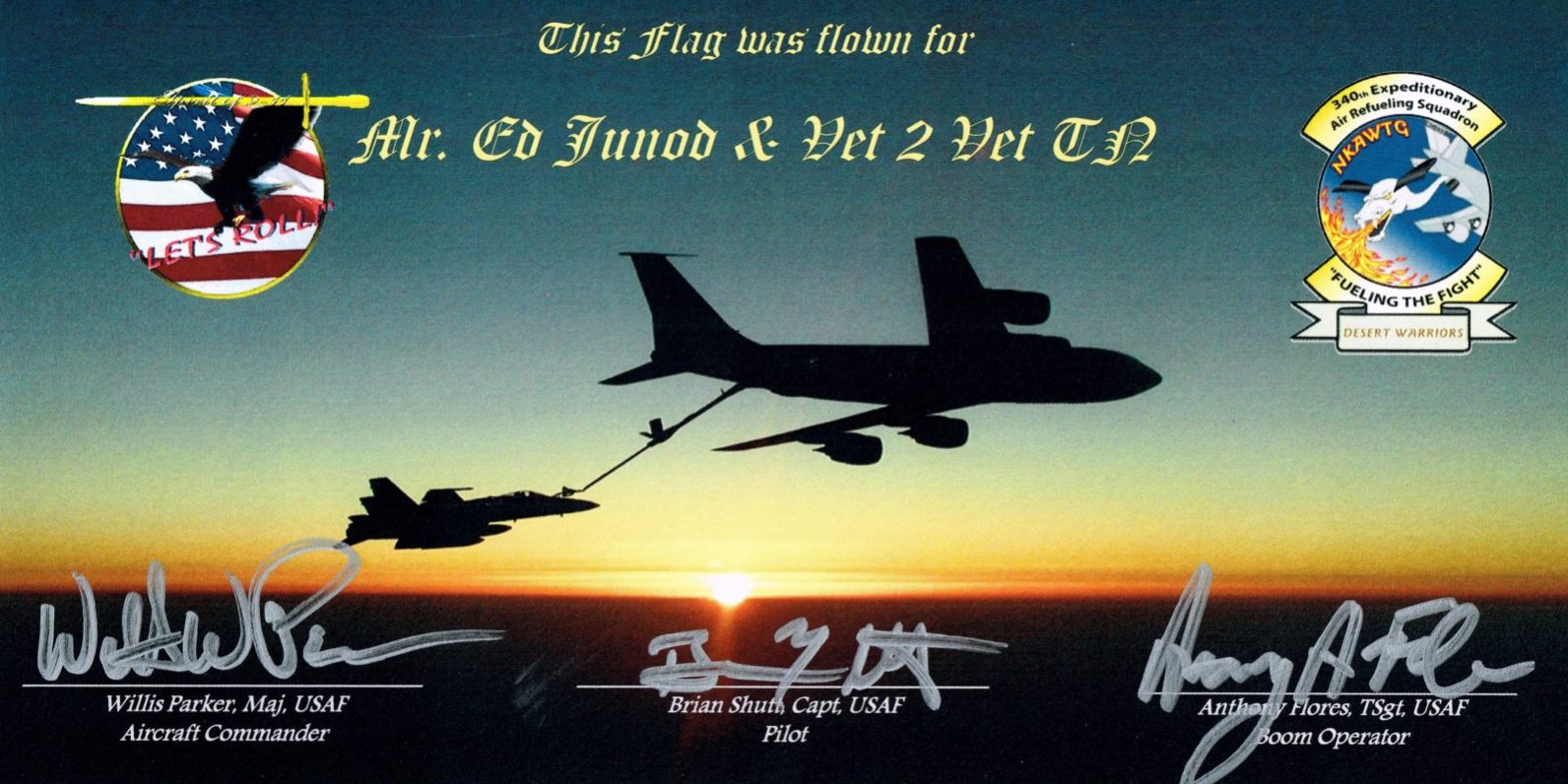 Willis Parker, Maj. USAF, Aircraft Commander with the 340th Expeditionary Air Refueling Squadron and Veterans Court Mentor in the 10th Judicial District, returned from another deployment in the Middle East. He stopped by unexpectedly at Vet to Vet Tennessee’s (V2VT) outpost on 11-30-16. Willis surprised the V2VT officers with his unexpected return and were humbled and honored to receive an American flag that was flown over Iraq for V2VT on November 10, 2016. in Iraq. Randy Scott, V2VT Vice President accepted the flag. Willis is holding the Certificate of Authenticity signed his the crew.