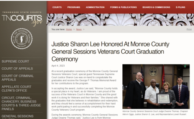Tennessee State Courts April 4, 2023 newsletter. Please click here to read the article about the Monroe County Veterans Court program.