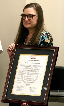 Jessica Carlton is accepting the Freddie J. Owens Memorial Award on behalf of the McNabb Center Military Service Center staff for over 11 years.