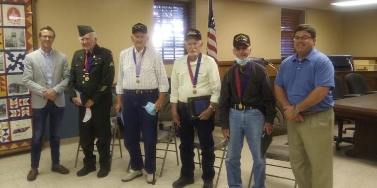 The four recipients are from left to right: William Queen (Army), JC Bledsoe (Army), Alvin Tallent (Navy), Arrants Kennedy (Army). Mr Jerome Reid (Navy) was not present for the ceremony due to health condition but he was presented the Medal and Proclamation at home by Susan Peglow.