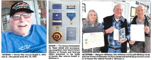 March 12 at the Vietnam Veterans of America Chapter 1123 of Perry County meeting, retiring Veterans Service Officer Dan Riley, President Dale Long, and Vice President Lindy Hester officially presented the Korean Ambassador for Peace Medal from South Korea’s Ministry of Patriots and Veterans Affairs to the family of Korean War Veteran Russell A. Whitman, Jr. Mr. Whitman passed away November 24, 2025. Accepting the medal on his behalf were his sons, Russell Whitman III and Ron Whitman, along with his wife, Margaret.