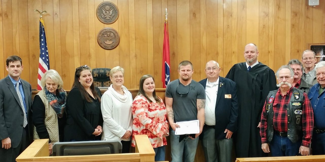left to right: Beverly Powell, Legal Assistant, Randy White, Chief Deputy Sheriff, Tyler Weiss, Attorney, Ellen Thomas, Judge’s mother, Jeannie Wiggins, Attorney, Doris Matthews, Attorney, Michelle Flatt, Brandon Flatt, Bob Hatley, Vet to Vet TN Mentor Coordinator, Judge Dwaine B. Thomas, Don Smith, DAV SR Commander, Honorable Tim Yates, Monroe County, Taylor Thomas, Vet to Vet TN Mentor, Dean Tulfford, DAV Commander, Karl Griffith, Vet to Vet TN Mentor.